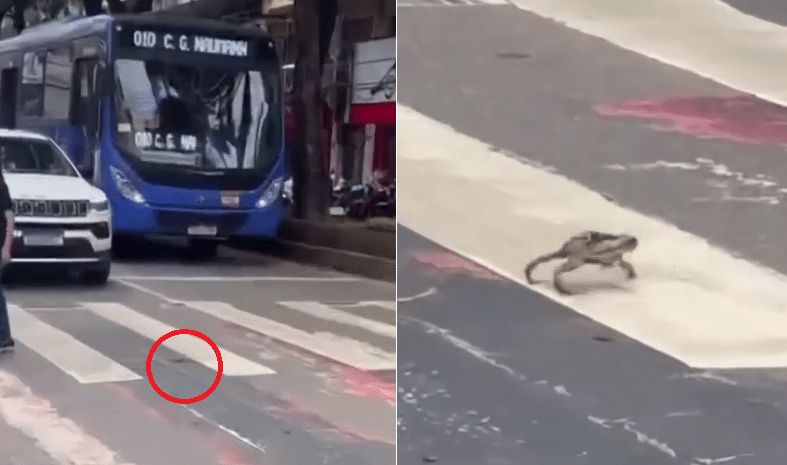 Uma cena inusitada chamou a atenção de quem passava pelo Centro de Colatina, no Noroeste do Espírito Santo, nesta terça-feira (6). Um sapo foi flagrado atravessando a rua exatamente pela faixa de pedestres, como manda a sinalização de trânsito.