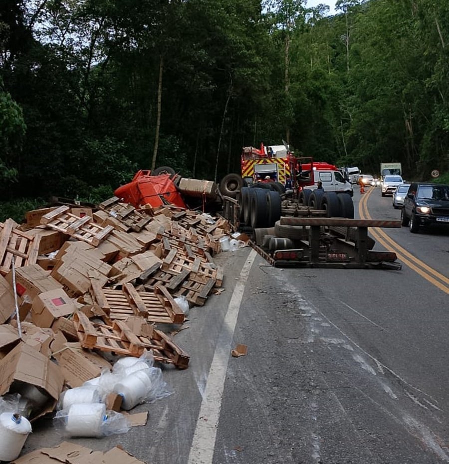 O Corpo de Bombeiros informou que o caminhão havia saído de Cariacica e ao passar pelo km 75, a carga se deslocou, puxando a carreta que acabou tombando na contramão. O motorista, que estava sozinho, consegui deixar a cabine, não se ferindo.