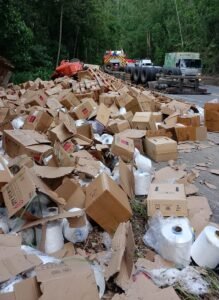Uma carreta carregada com rolos de algodão tombou na tarde dessa quarta-feira (14) em Domingos Martins. O motorista conseguiu sair do caminhão, não sofrendo ferimentos. O acidente aconteceu por volta das 16h35 na altura do km 75 da rodovia BR-262, neste município. A carreta ficou com os pneus para cima e toda a carga se espalhou às margens da pista. Uma longa fila de carro se formou no local após o acidente e o tráfego fluiu no sistema de pare e siga.